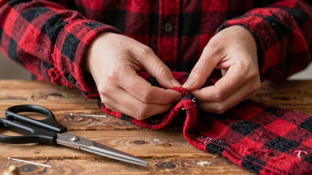 You’ll need a sharp pair of fabric scissors to start—trust me, they’re essential. When it comes to fabric selection, choose flannel shirts with vibrant patterns or soft textures. Use basic cutting techniques to carefully trim your fabric, ensuring clean edges for your cozy accessories. A fabric marker can help with precise measurements, but the real secret is having steady hands and a keen eye for detail. Ready to craft?