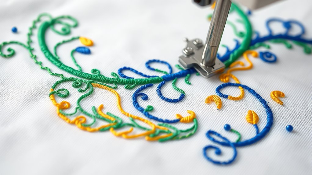 You should choose embroidery thread types with good thread qualities like strength, smoothness, and colorfastness. Polyester and rayon threads are popular because they glide easily and produce vibrant stitches. Cotton embroidery threads are also great for a softer look. Avoid cheap or low-quality threads, as they can cause thread breaks and tangles. Using the right embroidery thread types guarantees your free-motion embroidery remains smooth and professional-looking.