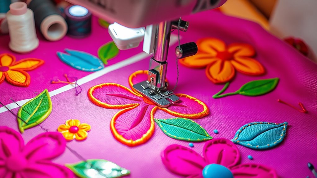 To further enhance your appliqué, consider using a fusible web or double-sided adhesive to temporarily hold your shapes in place before stitching. This simplifies the process and reduces puckering. As you sew around your shapes, keep a consistent seam allowance to maintain uniformity. Some sewists prefer a narrower zigzag stitch for delicate edges, while others opt for a wider stitch to create a more textured border. With practice, you’ll learn to control your machine’s stitch tension and speed for cleaner results. Remember, the key to successful machine appliqué lies in fabric selection and utilizing decorative stitches effectively—these elements work together to produce beautifully finished, professional-looking designs that showcase your creativity and sewing skills.