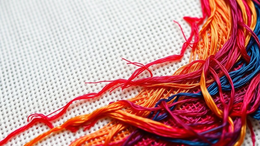 When fixing mistakes in a thread painting, you should carefully remove or cut the incorrect stitches to correct your color blending. Use a fine needle or tweezers for thread correction, gently pulling out the flawed stitches without damaging the fabric. Then, re-stitch with the correct shades, blending colors seamlessly. Take your time to guarantee smooth transition, and don’t rush—precise thread correction makes your artwork look polished and professional.