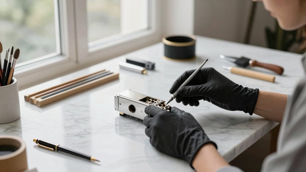 Maintaining consistent hand placement is essential for executing a polished pressing sequence that looks expensive. Your hand positioning and tool grip should stay uniform throughout the process, ensuring fluid motion and a refined appearance. A steady grip prevents unnecessary adjustments and keeps the project’s lines crisp. Focus on how your hands interact with the tool, maintaining a firm yet relaxed grip. Consistency here creates a seamless flow, elevating your work’s overall look. Consider this table for clarity: