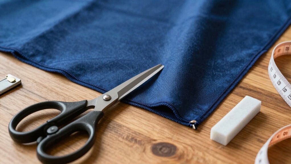 You can use regular scissors for trimming, but they might not give you the cleanest finish, especially on delicate fabric types. To guarantee precise cuts, maintain your scissors well by cleaning and sharpening them regularly. Using specialized trimming tools is often better, but if you stick with scissors, choose sharp, high-quality ones and tailor your technique to different fabric types. Proper scissors maintenance helps you achieve cleaner, more professional results.