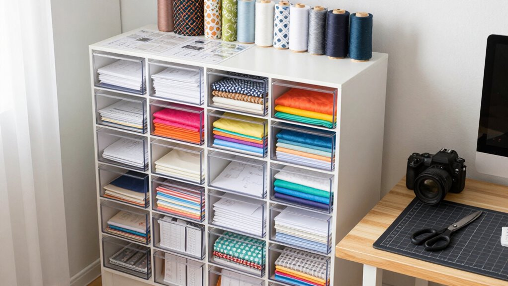 Choosing the right storage solutions for your printed patterns is essential to keep them organized and easily accessible. Pattern shelving is a great option, allowing you to display and sort patterns vertically or horizontally, making retrieval quick. Use sturdy storage containers to protect patterns from dust, moisture, and damage. Clear containers help you see what’s inside without opening each one, saving time. Label each container or shelf clearly to avoid confusion and streamline your process. Consider dividing patterns by type, project, or designer for even better organization. Avoid overcrowding your shelves or containers, which can make finding specific patterns frustrating. Implementing a systematic approach to organizing your collection can greatly improve efficiency and reduce clutter. With the right combination of pattern shelving and storage containers, you’ll keep your collection neat, protected, and easy to browse whenever inspiration strikes.