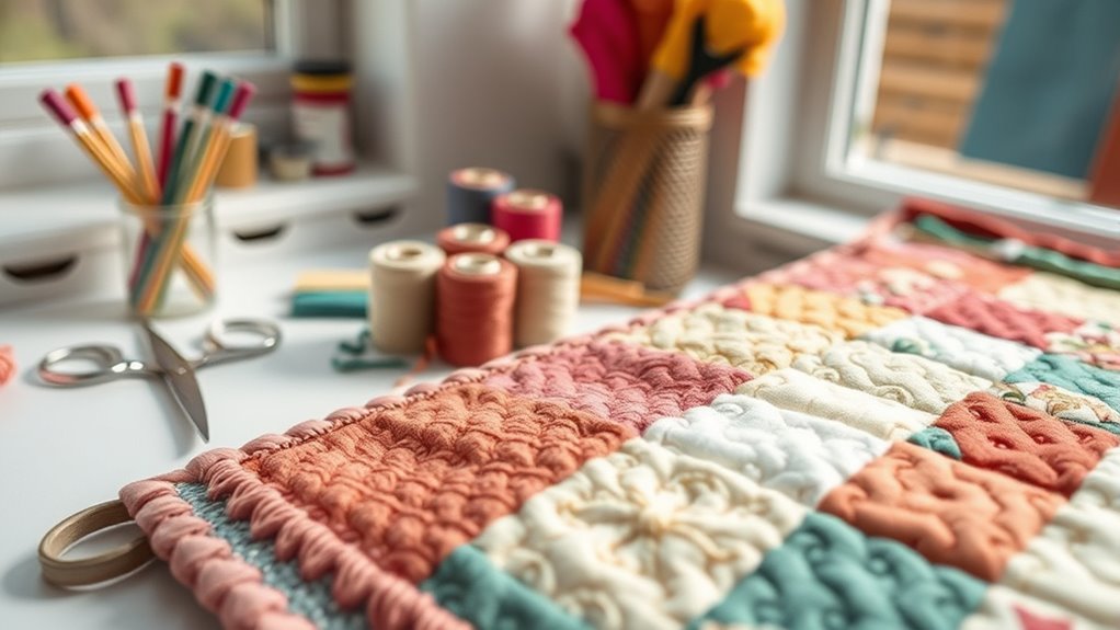 To effectively document your projects, start with soft, natural light near windows to avoid harsh shadows and glare. Use a tripod and manual focus to guarantee sharp images, and keep your ISO low for clarity. Compose your shots using the rule of thirds, showing enough space around your craft. Experiment with different angles and review your photos often to improve. Keep practicing these techniques to capture your work beautifully—more tips await to help you perfect your craft photography.