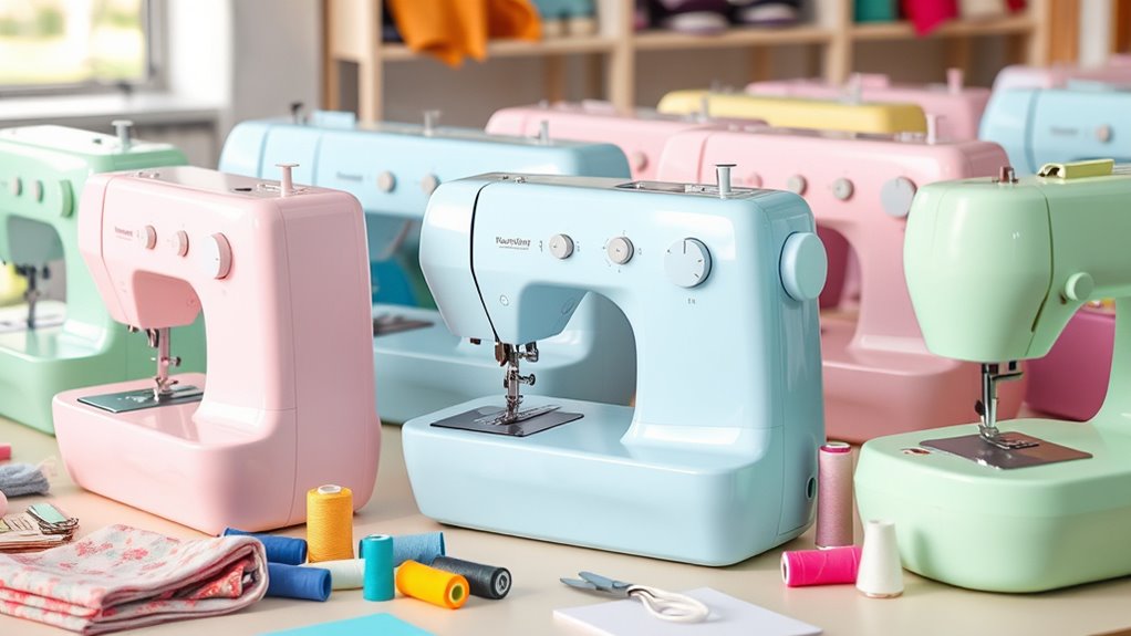 When choosing your first sewing machine, focus on reliable brands like Singer, Brother, or Janome that offer models with simple controls and essential features such as straight and zigzag stitches. Select a lightweight, sturdy machine that’s easy to transport and fits your space. Look for good customer support, durability, and a reasonable price. Starting with a quality machine sets a solid foundation—continue exploring to find the perfect fit for your sewing journey.
