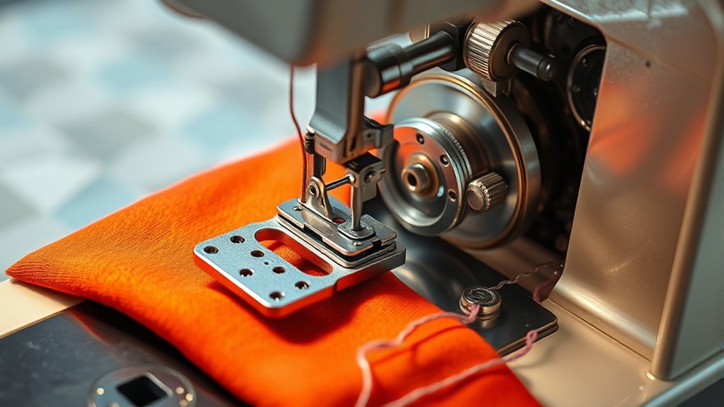 Beneath the needle plate, the bobbin mechanism plays a critical role in completing each stitch. The bobbin is a small spool that holds the lower thread, which interlocks with the upper thread created by the needle. When you start sewing, the machine’s bobbin case guides the bobbin thread upward through a small opening called the tension spring or bobbin tension. This tension is carefully calibrated to guarantee the bobbin thread pulls smoothly without slipping or bunching. As the needle moves down, it catches the bobbin thread through a loop, then pulls it up as the needle rises, creating a lockstitch. This intricate process depends on the precise operation of the bobbin mechanism, which must work seamlessly with the upper thread tension to produce even stitches. Proper maintenance of the bobbin case ensures consistent tension and smooth sewing performance.