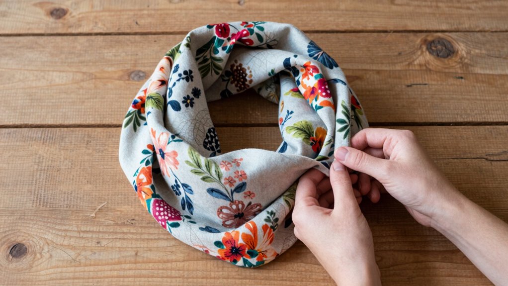 To create your no-sew cowl, start by selecting a scarf made from a soft, warm fabric like fleece, flannel, or thick knit. Your fabric choices should prioritize comfort and durability, ensuring the cowl stays cozy and maintains its shape. Look for scarves that are at least 60 inches long to give you enough material to fold and wrap comfortably around your neck. As for accessory options, consider adding decorative elements like tassels or fringes if you want a personalized touch. You don’t need any special tools—just your scarf and perhaps a pair of scissors to trim any uneven edges. The goal is to choose a fabric that feels good against your skin and complements your style for an easy, stylish transformation. Incorporating visual cues can also help ensure your no-sew cowl looks neat and well-formed. Paying attention to fabric selection can greatly improve the comfort and appearance of your finished cowl. Additionally, being aware of piercing aftercare tips can help you avoid unnecessary irritation if you wear your cowl close to the skin. Choosing fabrics with good stretch and recovery properties can help your cowl hold its shape and fit comfortably throughout the day.