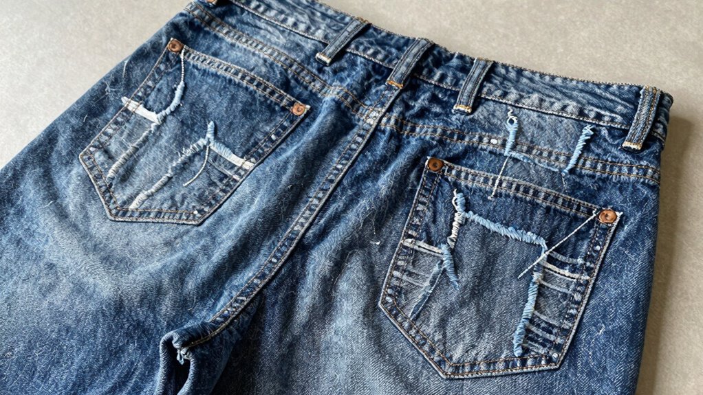 If you have old jeans sitting unused in your closet, you can breathe new life into them by transforming them into functional organizer pockets. This project is a perfect example of upcycling techniques that give your worn-out jeans a fresh purpose while reducing waste. To start, choose jeans with sturdy fabric, as this will help guarantee your pockets hold their shape over time. The key is to focus on fabric reinforcement; you want your pockets to be durable, especially if you plan to store heavier items. Reinforcing the fabric with interfacing or additional layers of denim can prevent tearing and stretching, making your organizer long-lasting.