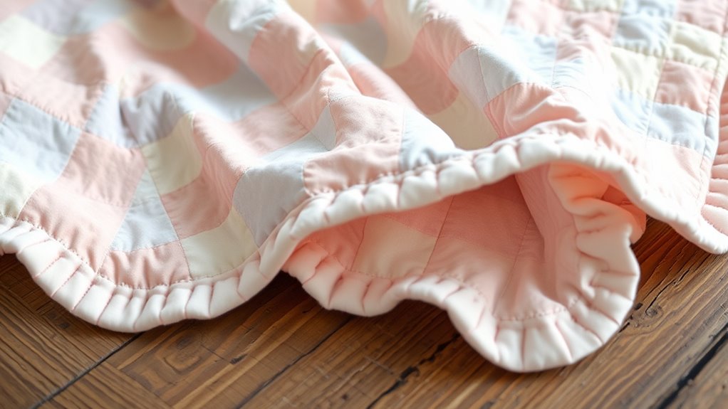 Start by choosing fabric choices that are soft, durable, and baby-friendly. Look for 100% cotton or cotton blends that are gentle against sensitive skin. Popular options include flannel, muslin, or lightweight quilting cotton, which are easy to work with and come in a variety of adorable patterns. Bright colors and playful prints make the quilt visually engaging, but subtle pastel shades also create a calming effect. Consider coordinating fabrics for the top, batting, and backing to ensure a cohesive look. Keep in mind that fabrics with washable features will hold up better over time, especially since baby blankets need frequent laundering.