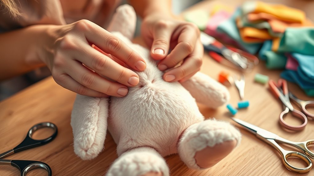 To sew an easy plush toy, start by selecting soft, high-quality fabric like fleece or velour, then cut out your pattern pieces carefully. Pin or clip the pieces together, sew along the edges leaving an opening for stuffing, and turn the toy right side out. Fill it evenly with stuffing to keep it soft and firm, then close the opening securely. With simple stitches and patience, you’ll create a charming stuffed animal—keep going to discover detailed steps and tips.