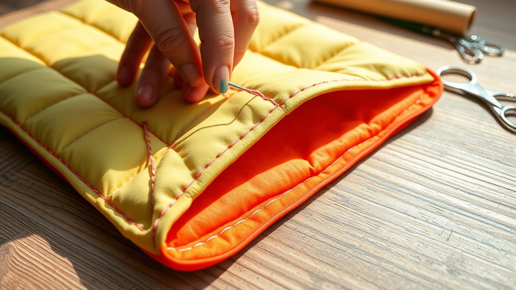 To sew a padded laptop sleeve, start by choosing durable, soft fabrics like denim or canvas and cutting your outer, lining, and padding to size with a quarter-inch seam allowance. Sew horizontal lines on the padding to prevent shifting, then layer the outer fabric, padding, and lining, pinning everything securely. Sew around the edges, leaving an opening for turning, then turn right side out, reinforce the corners, and add topstitching for a neat finish. For more detailed tips and step-by-step guidance, continue exploring the process.
