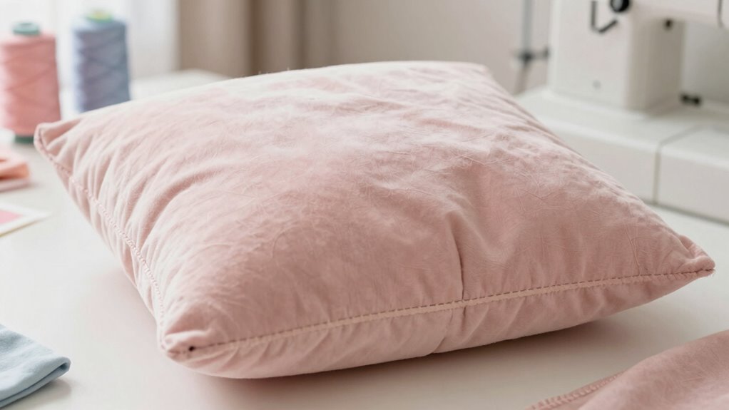 Sewing your pillow cover is a straightforward process that guarantees your pillow is both comfortable and durable. Start by choosing fabric patterns that match your style and purpose. Use a sharp needle and matching thread to ensure clean, strong seams. Fold the fabric right sides together and pin the edges, keeping the fabric flat to avoid puckering. Employ basic sewing techniques like straight stitching along the edges, leaving an opening for stuffing. Reinforce the corners with backstitches for extra durability. Once sewn, trim excess fabric and clip corners for smooth edges. Turn the cover right side out and press the seams flat. Additionally, selecting appropriate fabrics such as natural fibers or durable textiles can enhance the longevity and comfort of your pillow cover. Incorporating sewing best practices such as maintaining consistent stitch length and tension can further improve the durability of your finished pillow. These careful sewing techniques will give your pillow cover a professional finish, ensuring it lasts through daily use.