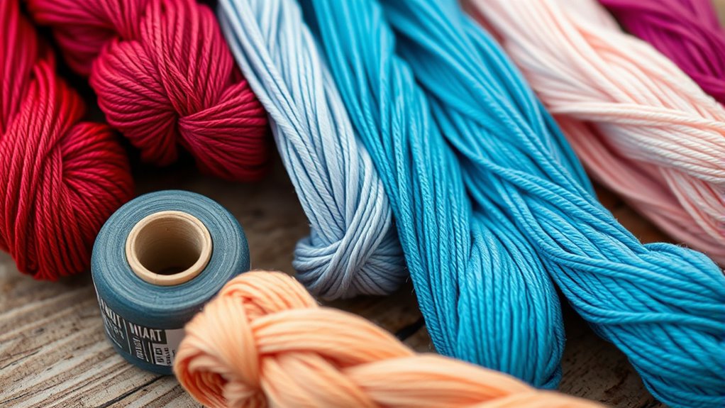 When choosing 100-percent cotton threads for quilting, durability and strength are essential factors that can make or break your project. High ply counts, like 3-ply or more, generally provide greater strength and resistance to breaking under tension. Mercerized cotton threads are especially durable, as they resist fraying and have increased tensile strength. Thicker thread weights, such as 30WT or 50WT, are less prone to breakage and better suited for heavy-duty quilting. The quality of the cotton fiber also matters—long-staple cotton creates stronger, more durable threads. Proper storage and handling are equally important; keeping threads in a dry environment and avoiding excessive tension during sewing will prolong their lifespan and maintain their strength throughout your quilting journey.