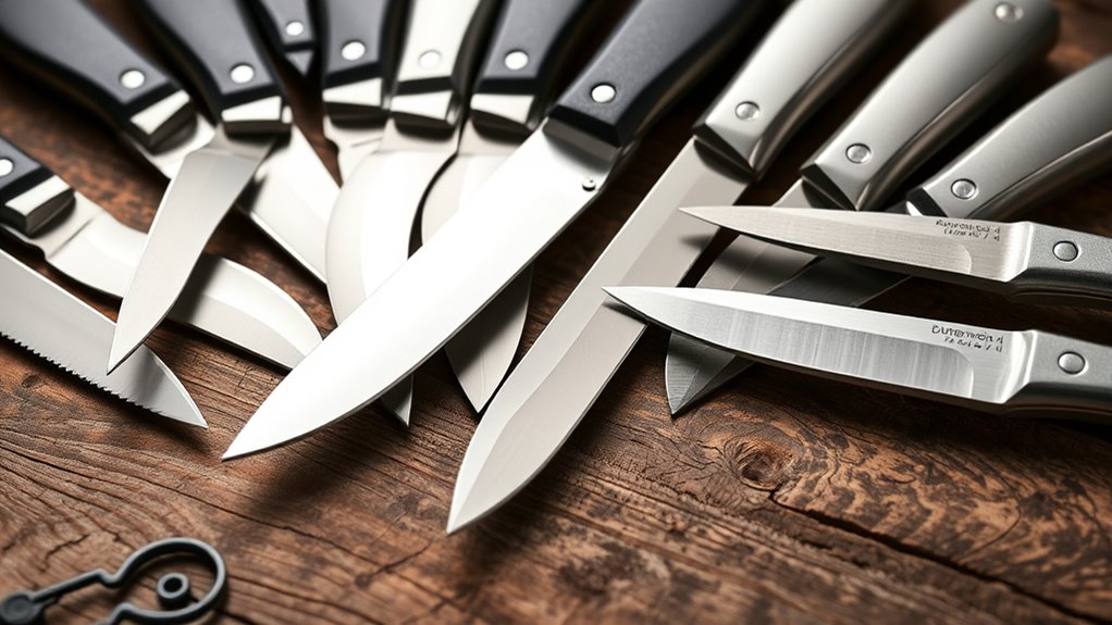 Thinking of carving knives for left-handed use is like finding a glove that fits perfectly—rare but possible. I’ve discovered that some brands, like Flexcut and Morakniv, offer ambidextrous or left-specific blades that feel natural in my hand. These knives provide better control and comfort, making my craft more enjoyable. If you’re left-handed, look for tools explicitly marked for left or ambidextrous use to guarantee precision and ease.