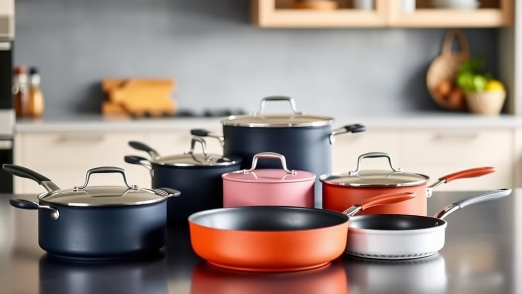 Choosing a high-quality cookware set means paying close attention to the materials used, as this directly impacts safety and durability. I look for cookware made from non-toxic materials like ceramic, stainless steel, or reinforced aluminum, which ensure longevity and safe cooking. Non-stick coatings should be free from harmful chemicals such as PTFE, PFOA, and PFAS to prevent toxins from leaching into food. Materials like 5-ply stainless steel or reinforced die-cast aluminum promote even heat distribution, minimizing hot spots and improving results. It’s also important that the cookware is oven-safe at high temperatures, usually up to 550°F, and compatible with various stovetops, including induction. Ultimately, certifications indicating non-toxic, eco-friendly, and food-safe materials help confirm the cookware’s safety standards.