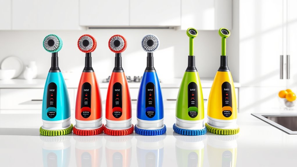 Choosing an electric spin scrubber requires paying close attention to its surface compatibility to avoid damage and guarantee effective cleaning. I always check if the brush heads are suitable for the surfaces I plan to clean, like tiles, glass, or delicate materials, to prevent scratching. I look for specialized brushes or attachments designed for specific areas, such as grout lines or soft surfaces, to target tough spots without harm. Water resistance is vital—matching the waterproof rating (like IPX7 or IPX8) to my environment ensures safe use in wet or submerged areas. Also, I verify the size and shape of the brush heads to reach corners, crevices, and curved surfaces effectively. This way, I get thorough cleaning without risking damage to my surfaces.