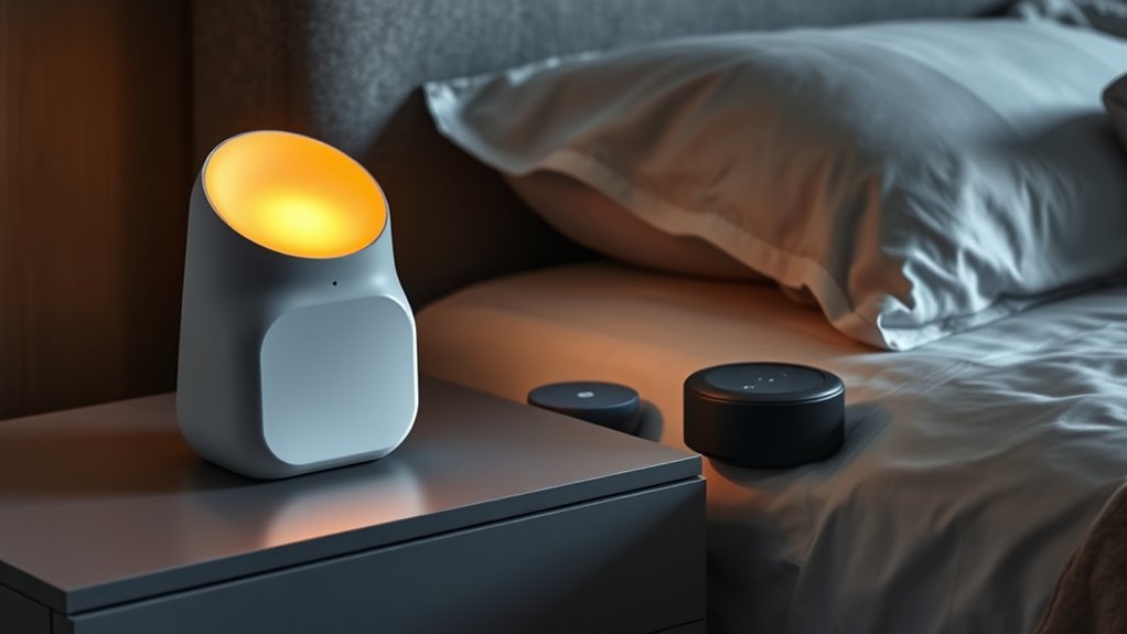 Many non-Hatch sleep devices come with safety features like auto shut-off timers, sleep mode locks, and secure charging ports to prevent overheating or electrical issues. I always look for devices with certified materials, sturdy construction, and clear user instructions to guarantee safety. These features help me sleep peacefully, knowing my device is designed with my safety in mind. Always check product details to confirm safety features before purchasing.