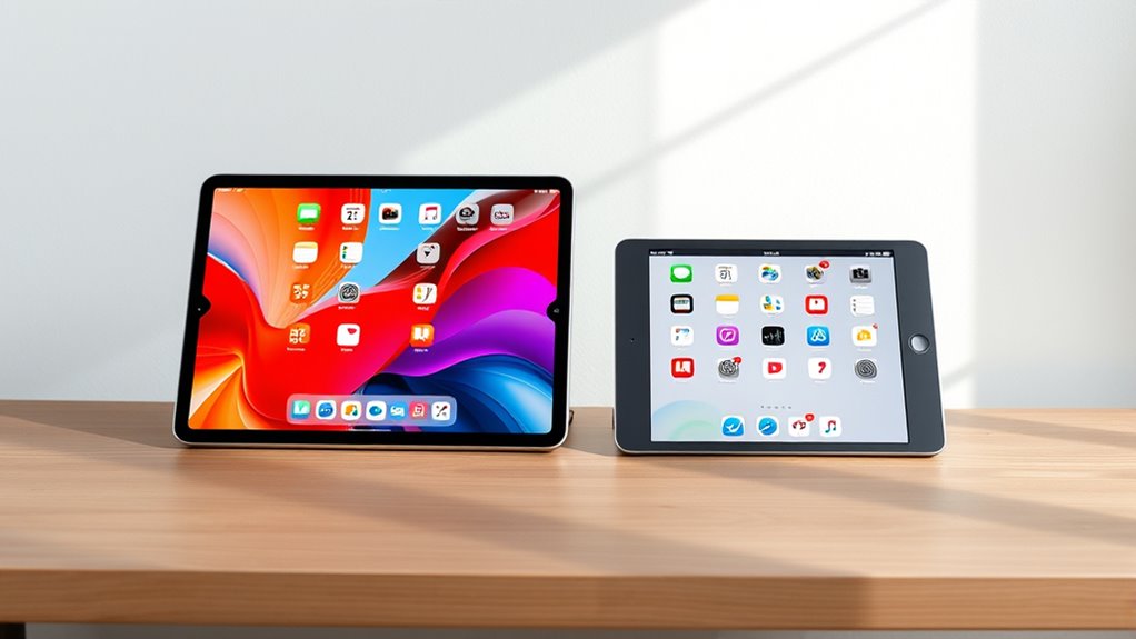 Choosing the right display size and quality is essential because it directly affects how we interact with our iPads for both work and entertainment. The iPad Pro 2025 offers a larger 12.9-inch display, giving me more space for multitasking, drawing, and detailed media work. Its high-resolution Retina display with True Tone makes images sharp and colors vibrant. The Pro’s higher refresh rate of up to 120Hz guarantees smoother visuals, ideal for creative tasks and scrolling. Meanwhile, the iPad Air’s 10.9 to 11-inch Liquid Retina display strikes a good balance between size and clarity, making it easier to carry around. Both models deliver excellent visual quality, but the Pro’s larger screen enhances productivity, while the Air’s size is more convenient for students on the move.