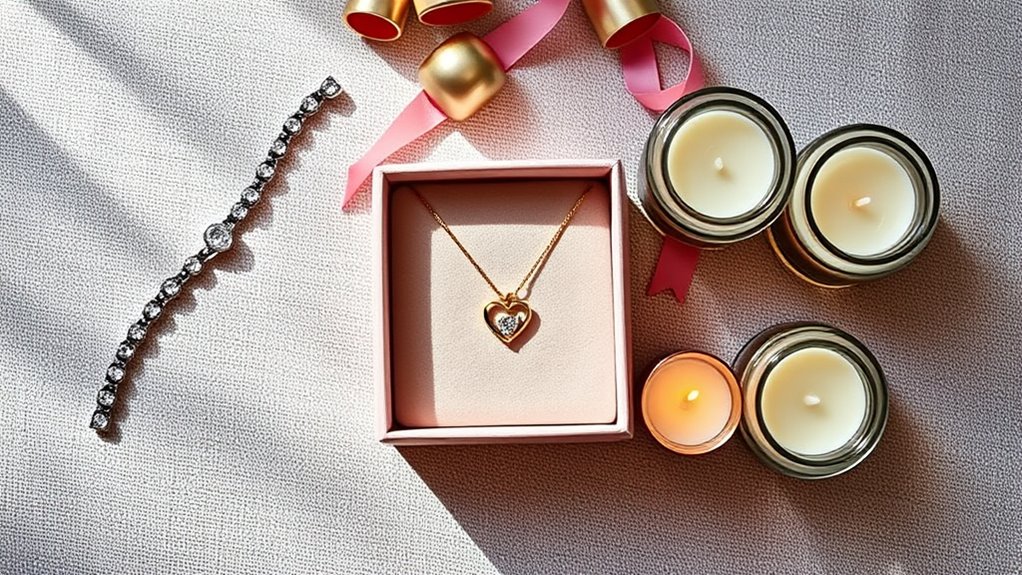 You can personalize luxury gifts under $200 by adding her initials or a special message with a custom engraving. Choose elegant jewelry, like a delicate necklace or bracelet, and opt for a meaningful charm or pendant. Consider monogrammed accessories, such as a leather journal or a cozy blanket. Personal touches make even simple gifts feel unique and thoughtful, showing her you care without breaking the bank.