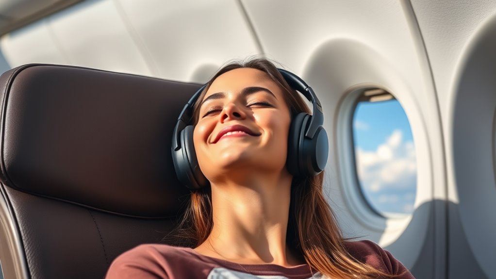 Comfort and fit are essential considerations because even the best noise-cancelling features won’t help if your headphones cause discomfort during long travels. A good fit with adjustable headbands and soft ear cushions prevents fatigue and soreness. Over-ear designs with memory foam padding offer superior comfort and noise isolation compared to on-ear or in-ear models. Lightweight headphones, usually under 0.7 pounds, reduce strain and are more comfortable for extended wear. Breathable, pressure-free padding helps maintain comfort, especially in warm environments or long hours of use. Ensuring a secure fit with flexible, adjustable components minimizes slipping and enhances noise cancellation effectiveness. Prioritizing comfort and fit ensures your headphones remain comfortable throughout your journey, letting you focus on enjoying your flight.