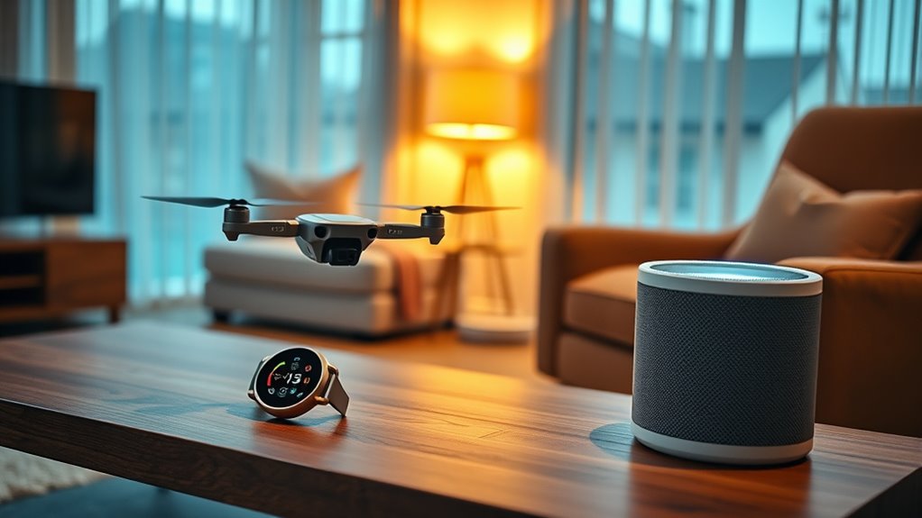 When selecting tech gifts for dad in 2025, I consider key factors like compatibility with his devices and connectivity options to guarantee seamless use. I also think about battery life, comfort, and fit so he can enjoy the gift without hassle. Ultimately, I look for multi-functionality and durable materials to make sure the gift is practical and long-lasting.